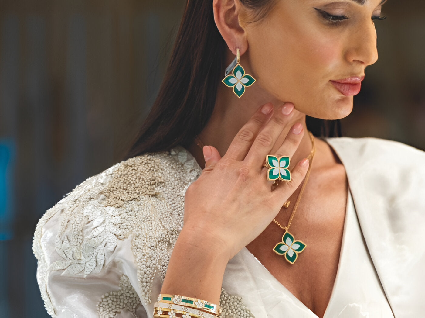 Reem & Jolly designs were paired with Roberto Coin’s luxury jewelry, creating a refined blend of couture and fine craftsmanship.