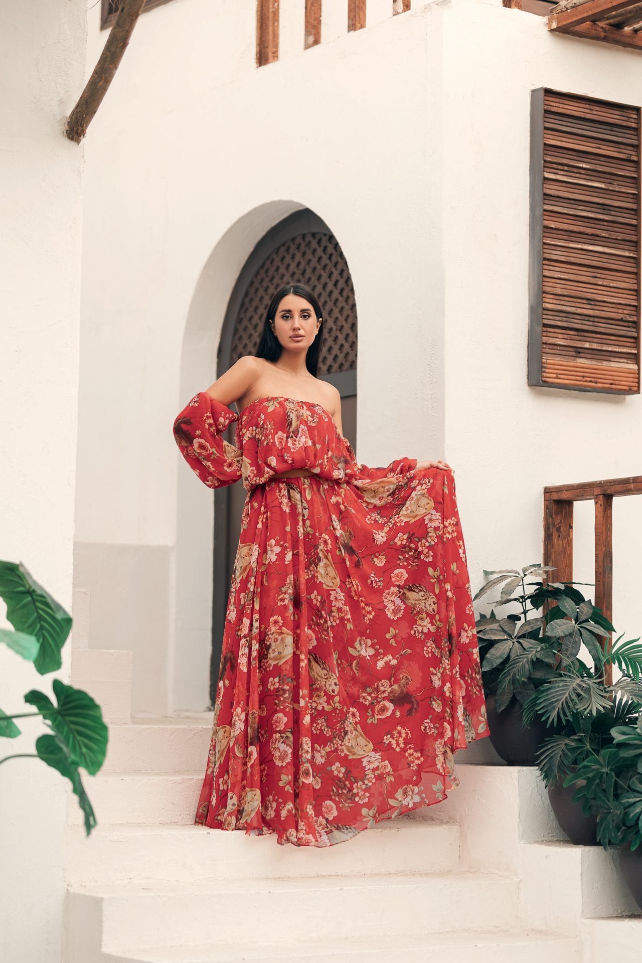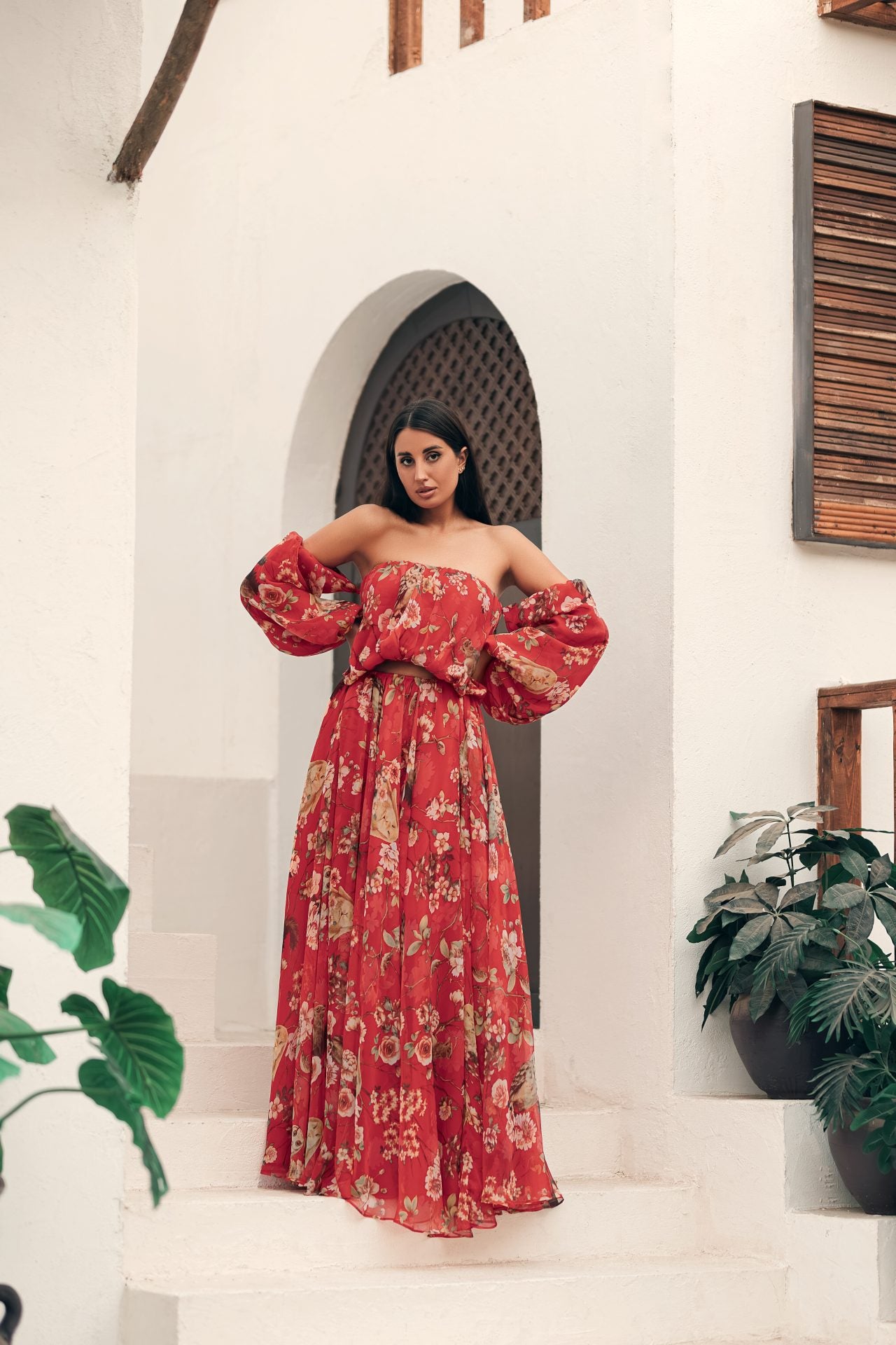 • طقم من قطعتين تنورة وقميص بأكمام