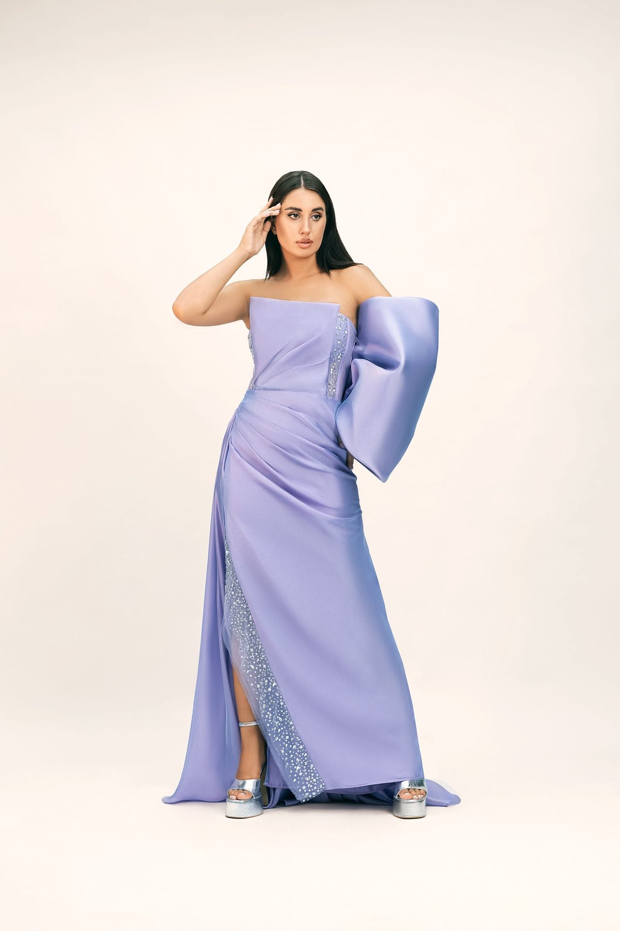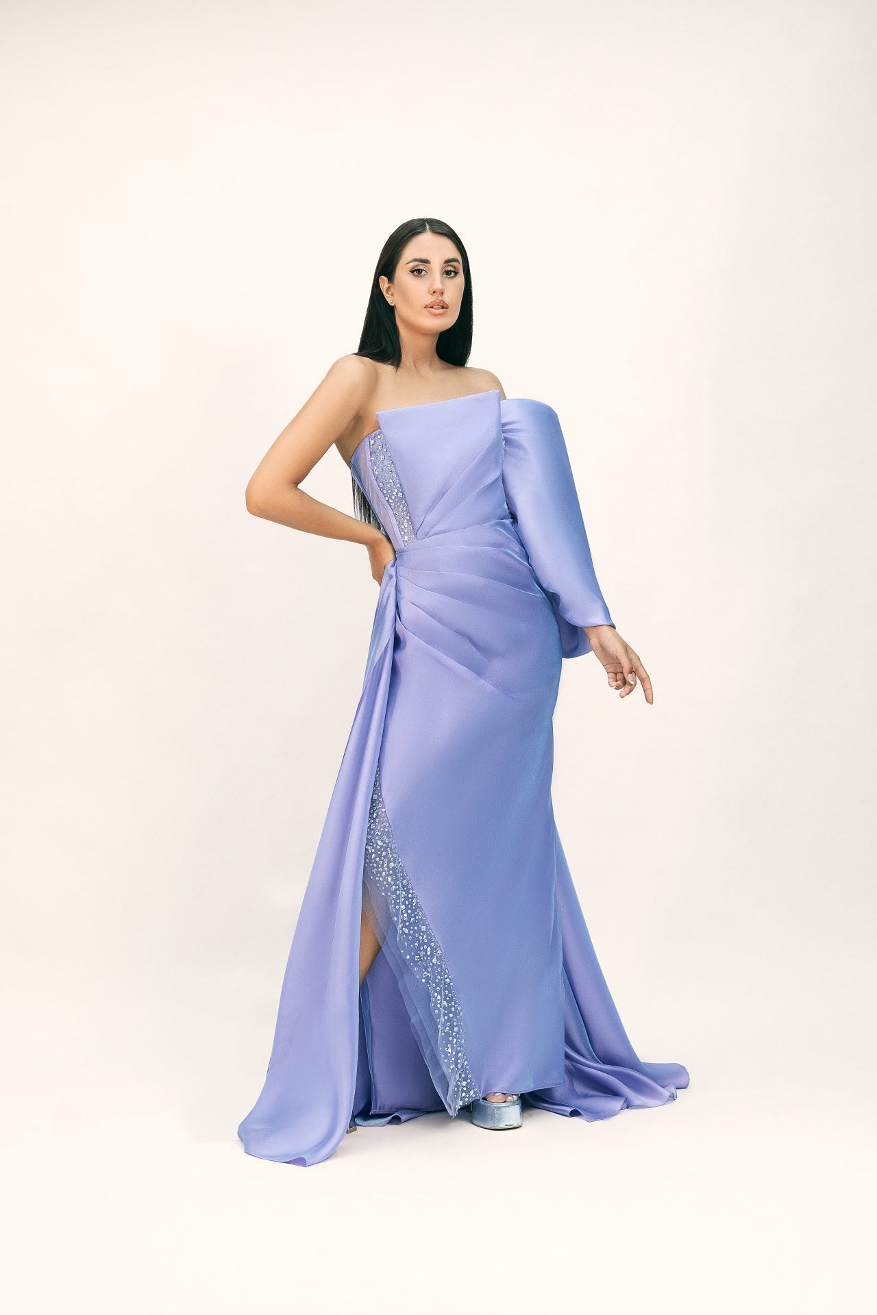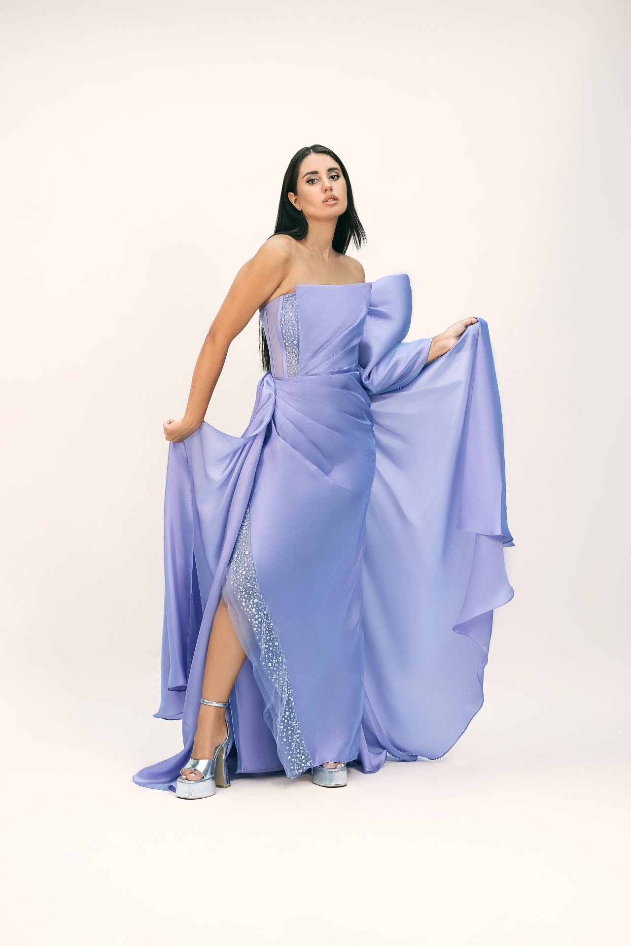 فستان طويل ناعم ولامع مع لمسات مطرزة باللون الفضي ✨