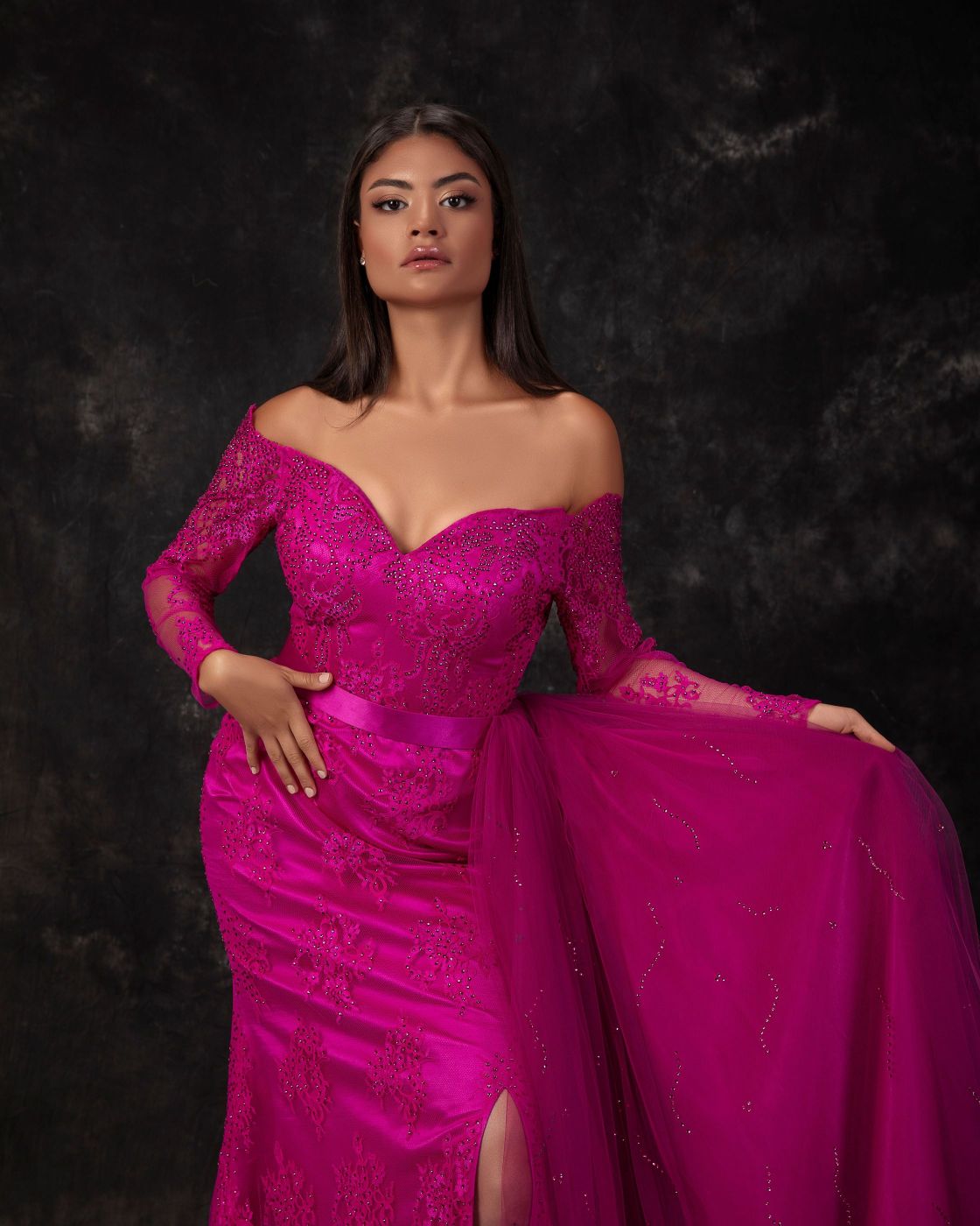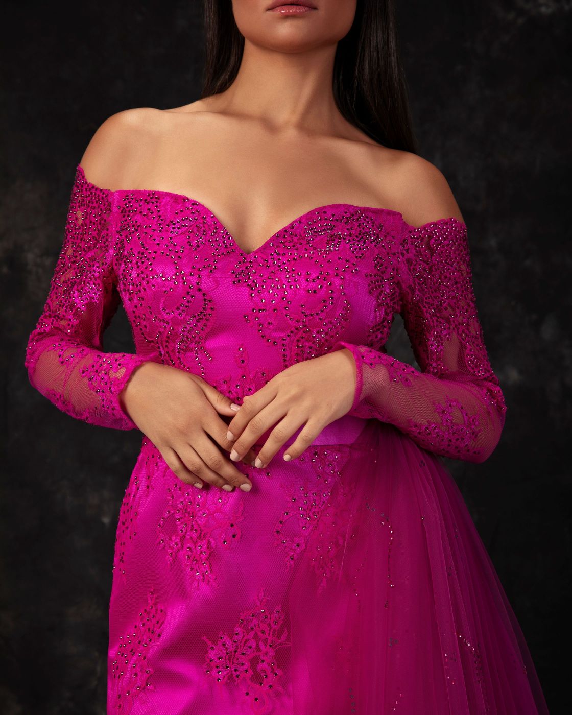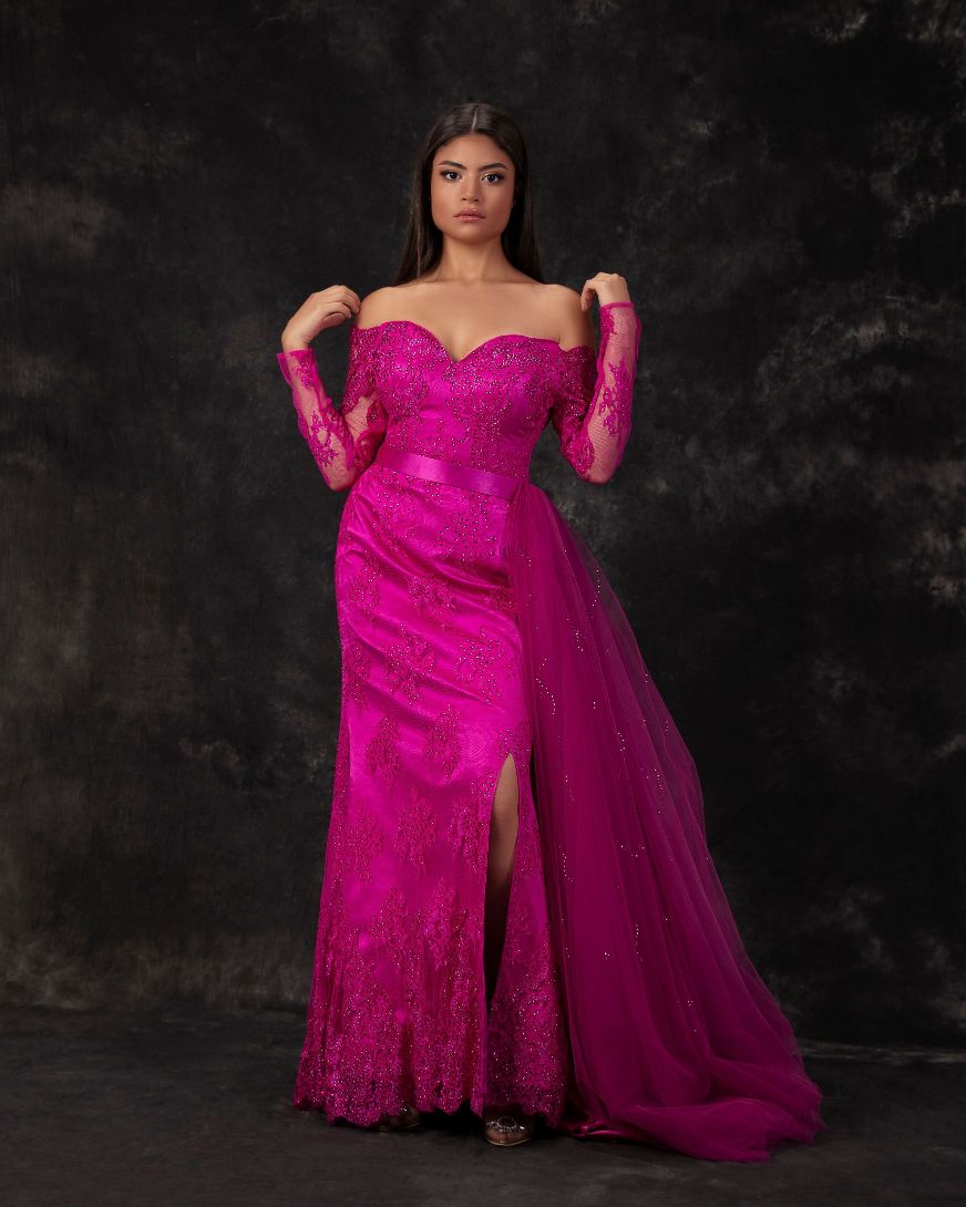• فستان سهرة فوشيا مكشوف الكتفين