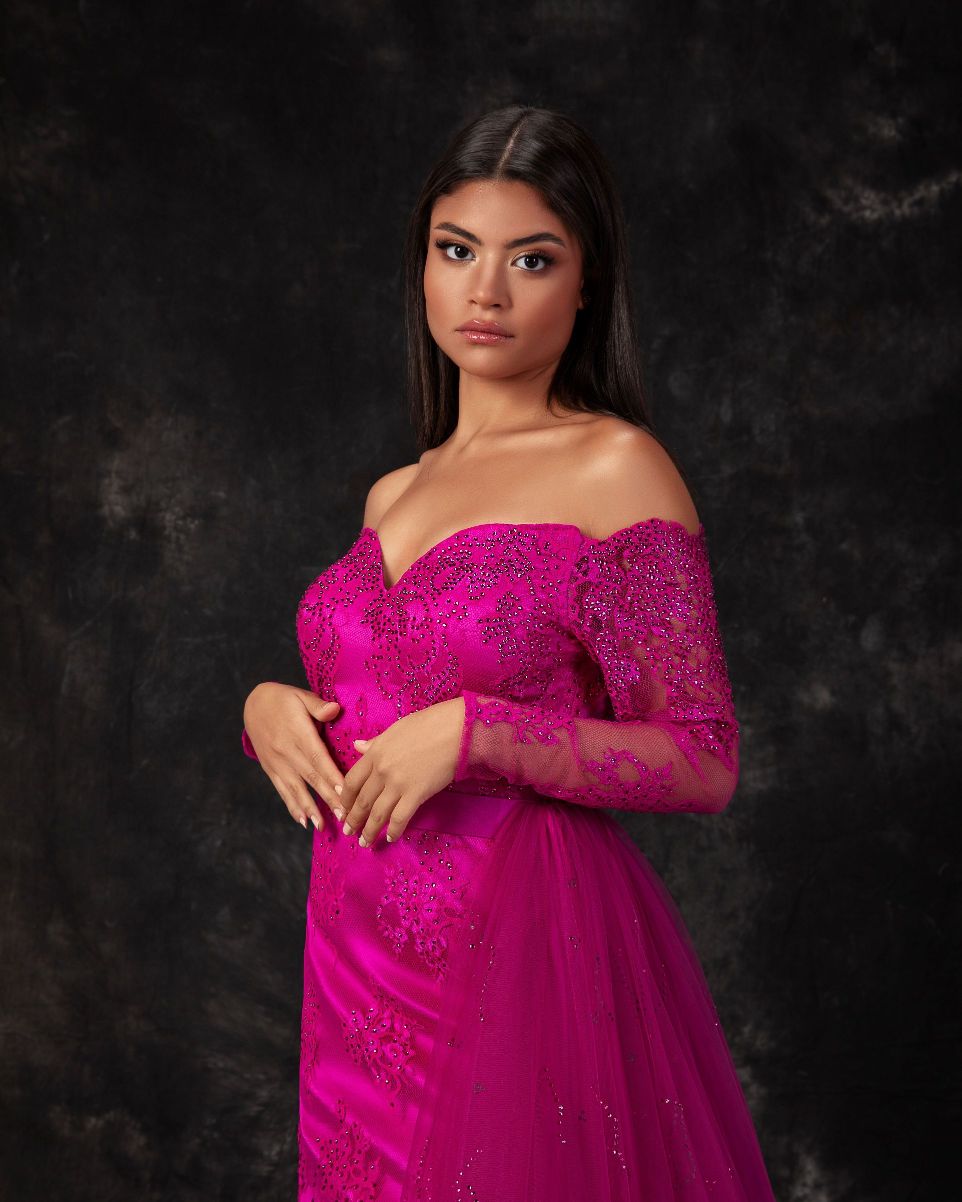 فستان سهرة فوشيا مكشوف الكتفين