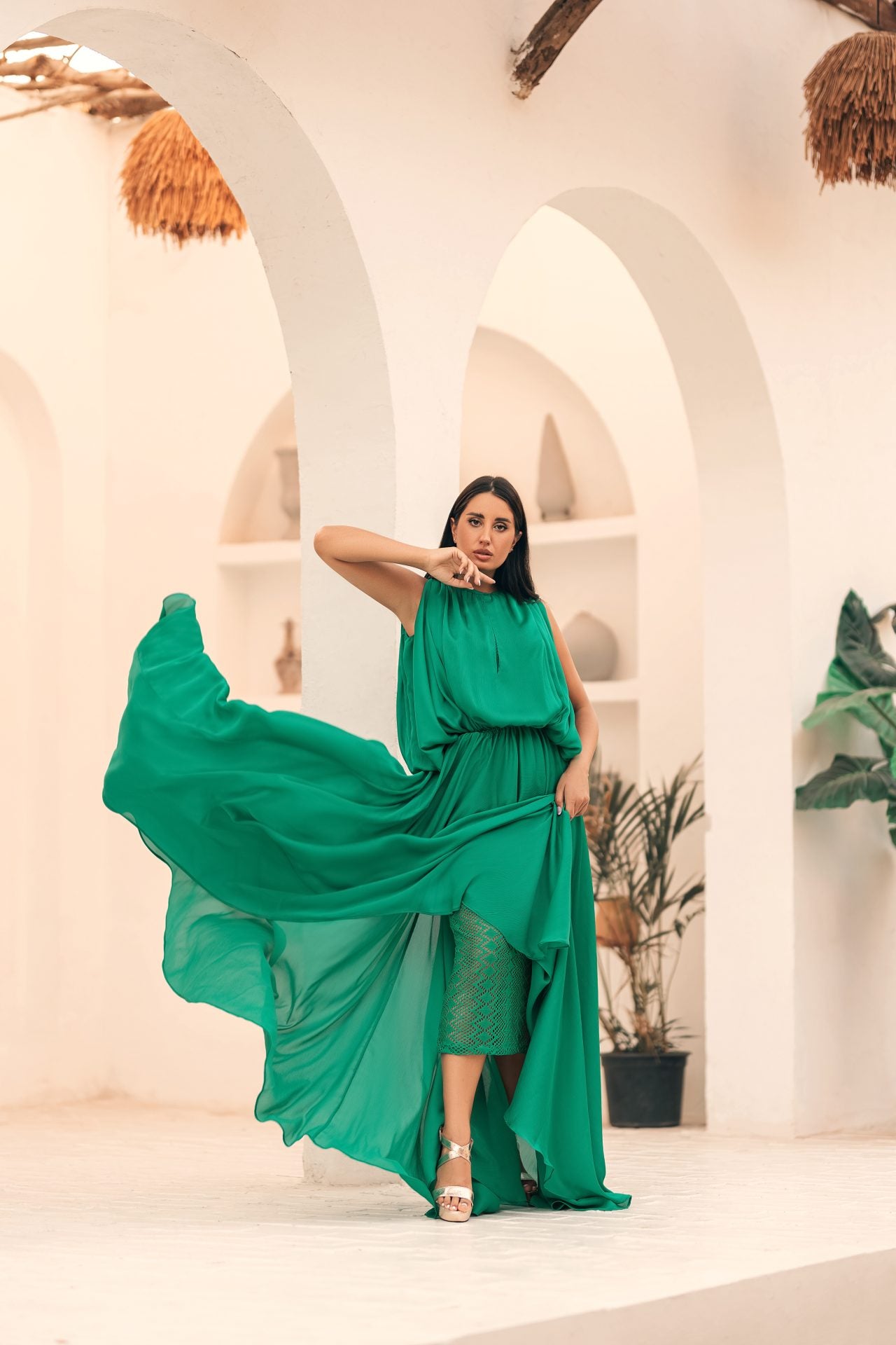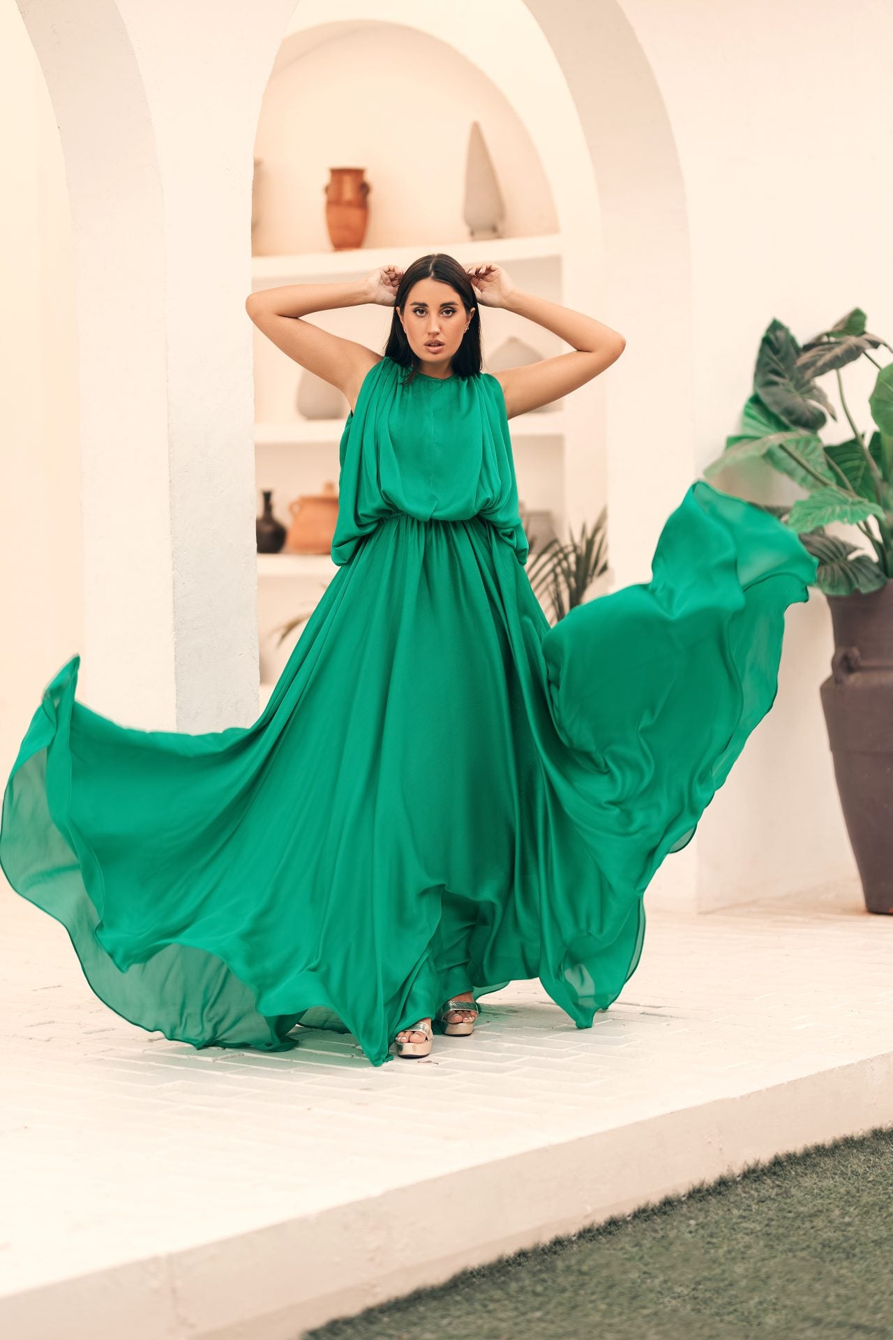 • فستان حريري طويل باللون الأخضر