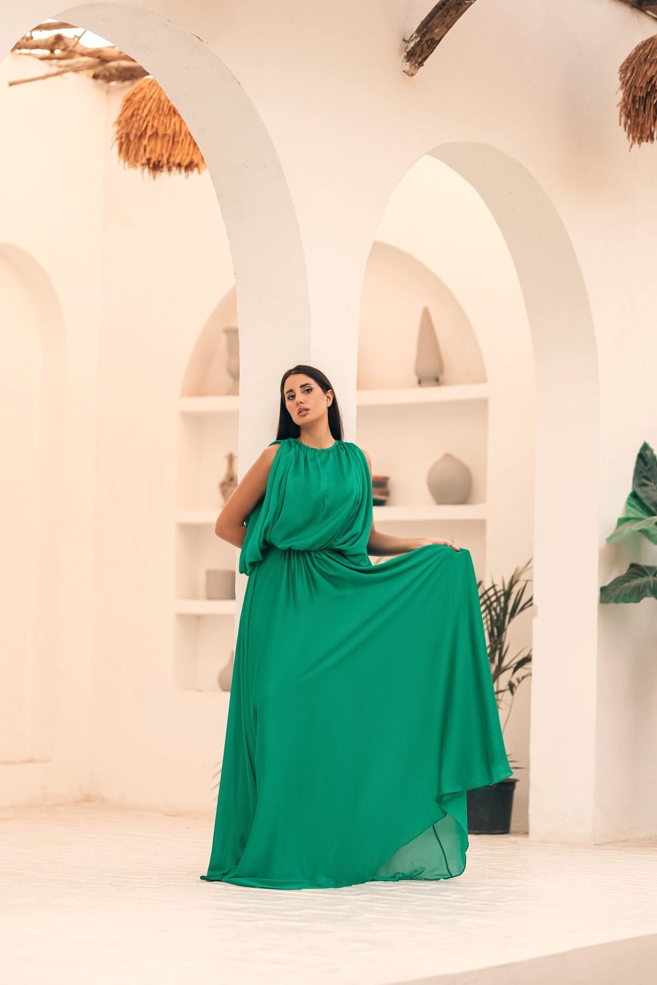 فستان حريري طويل باللون الأخضر