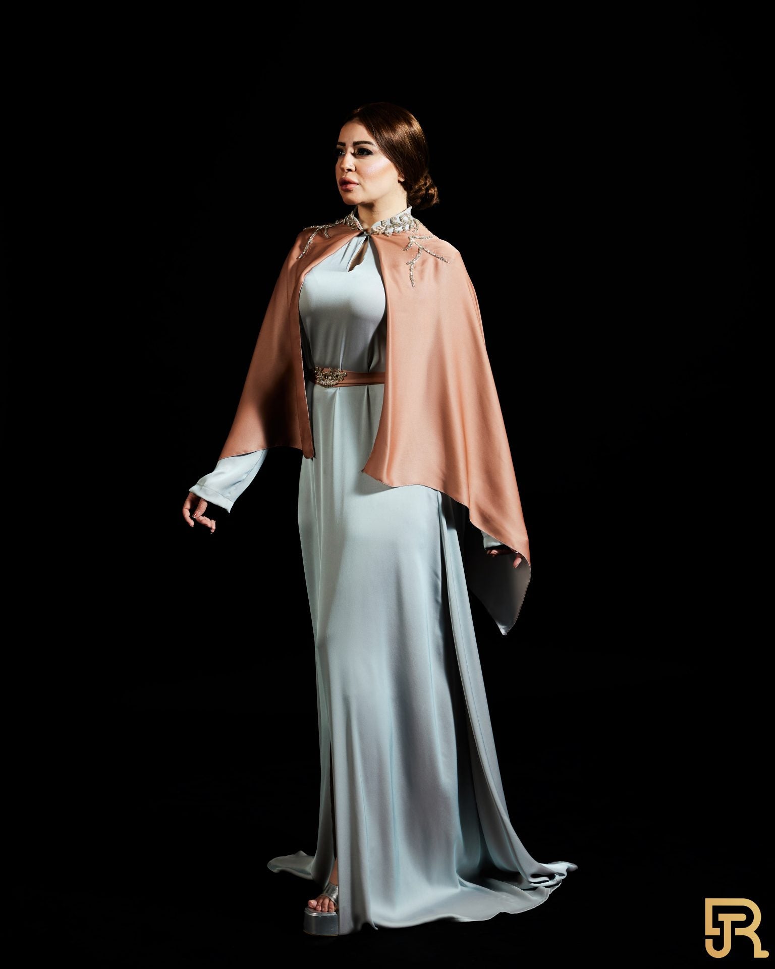 فستان رمادي بحزام مع قبعة مطرزة باللون البني