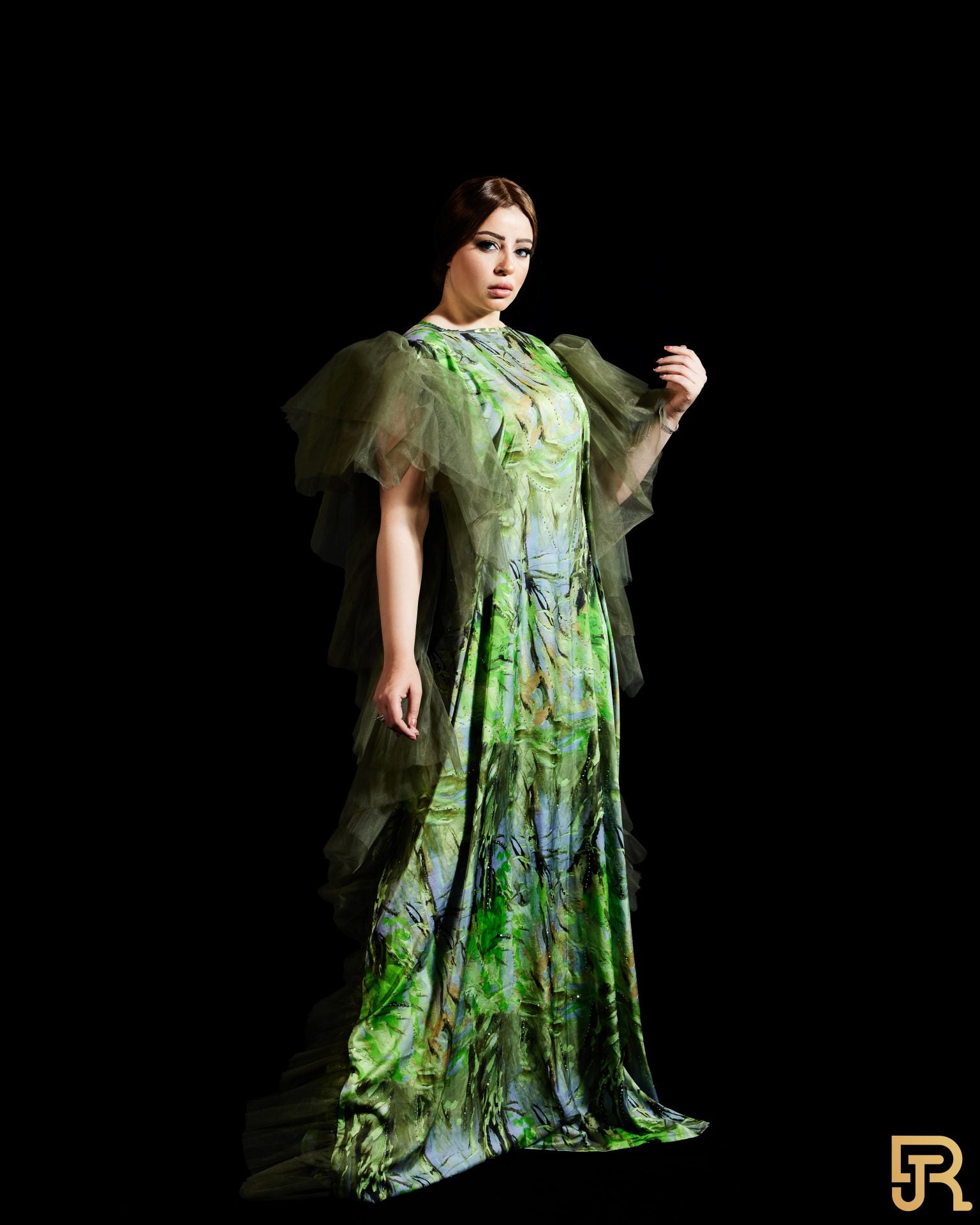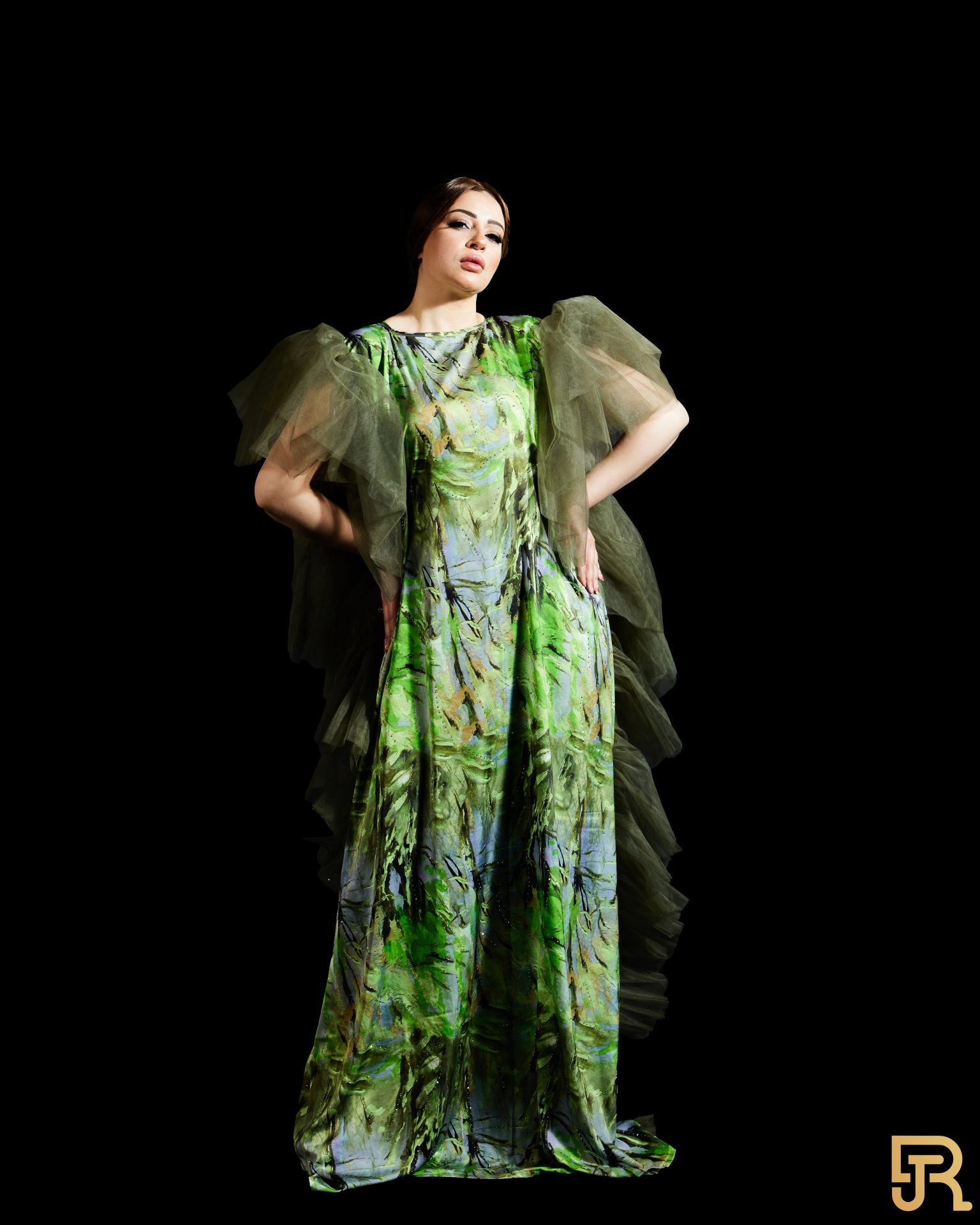 • فستان حريري أخضر مع تول