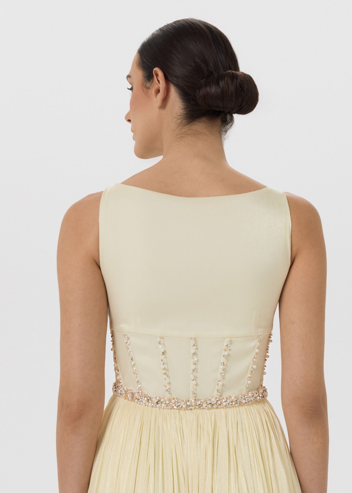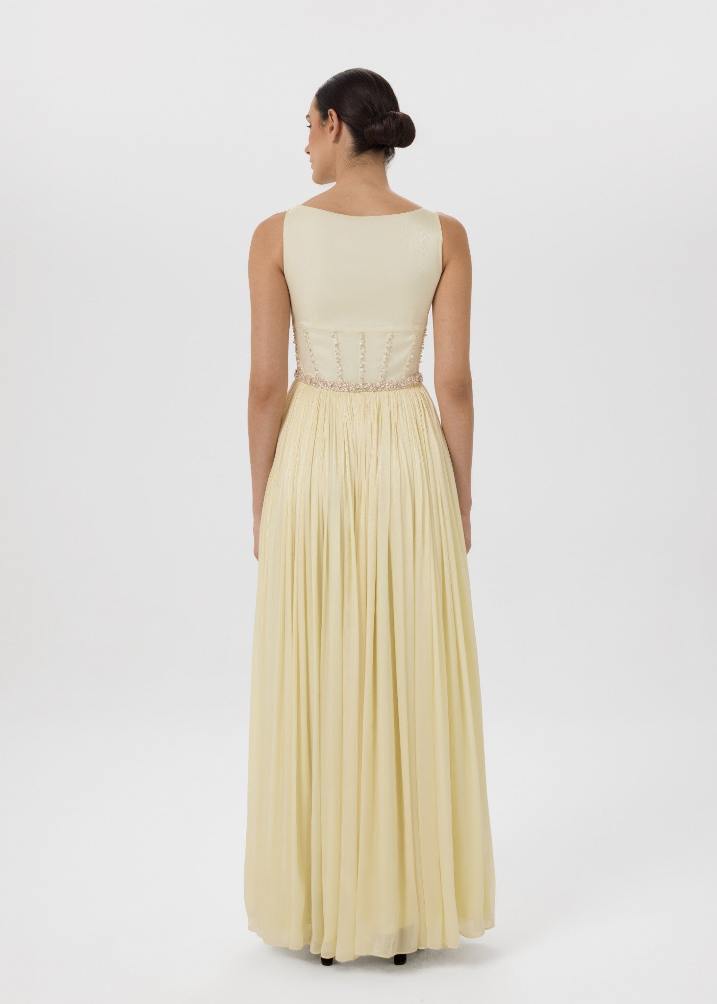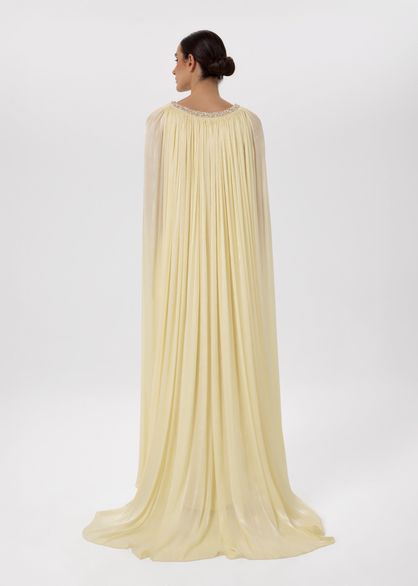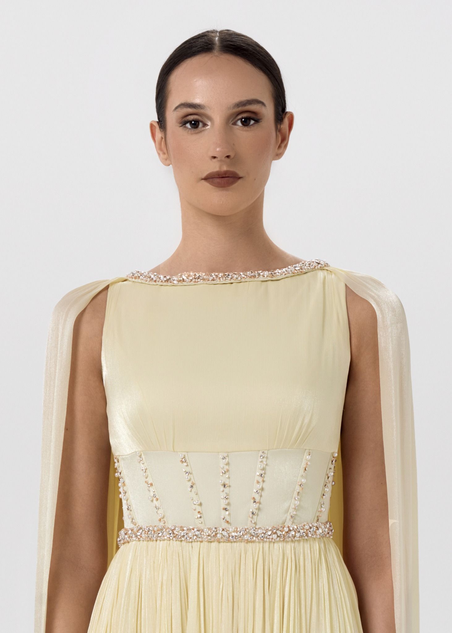 A floor-length chiffon gown featuring a softly structured bodice, crystal-embellished waistband and neckline, and a dramatic flowing cape back. The silhouette is graceful, formal, and timeless. Perfect for eveningwear, weddings, and special occasions.
