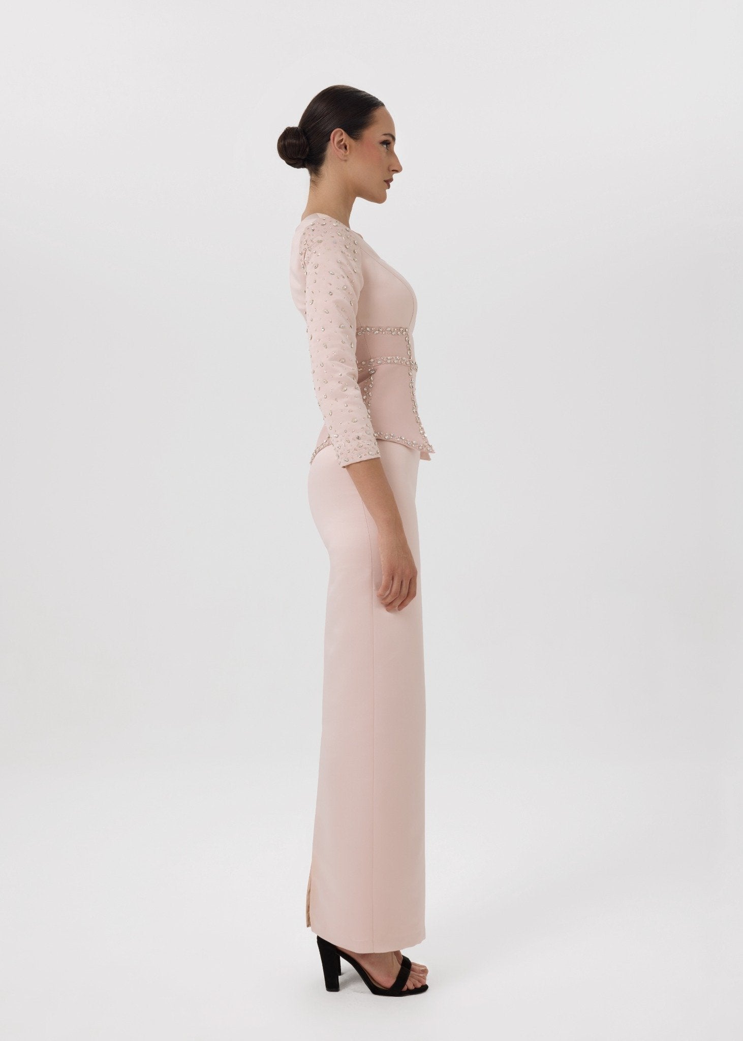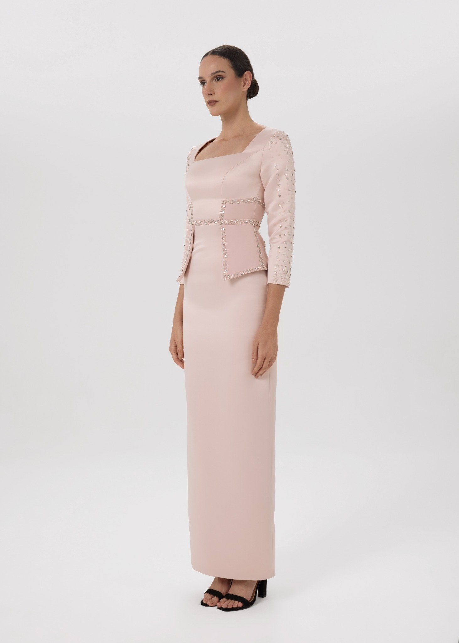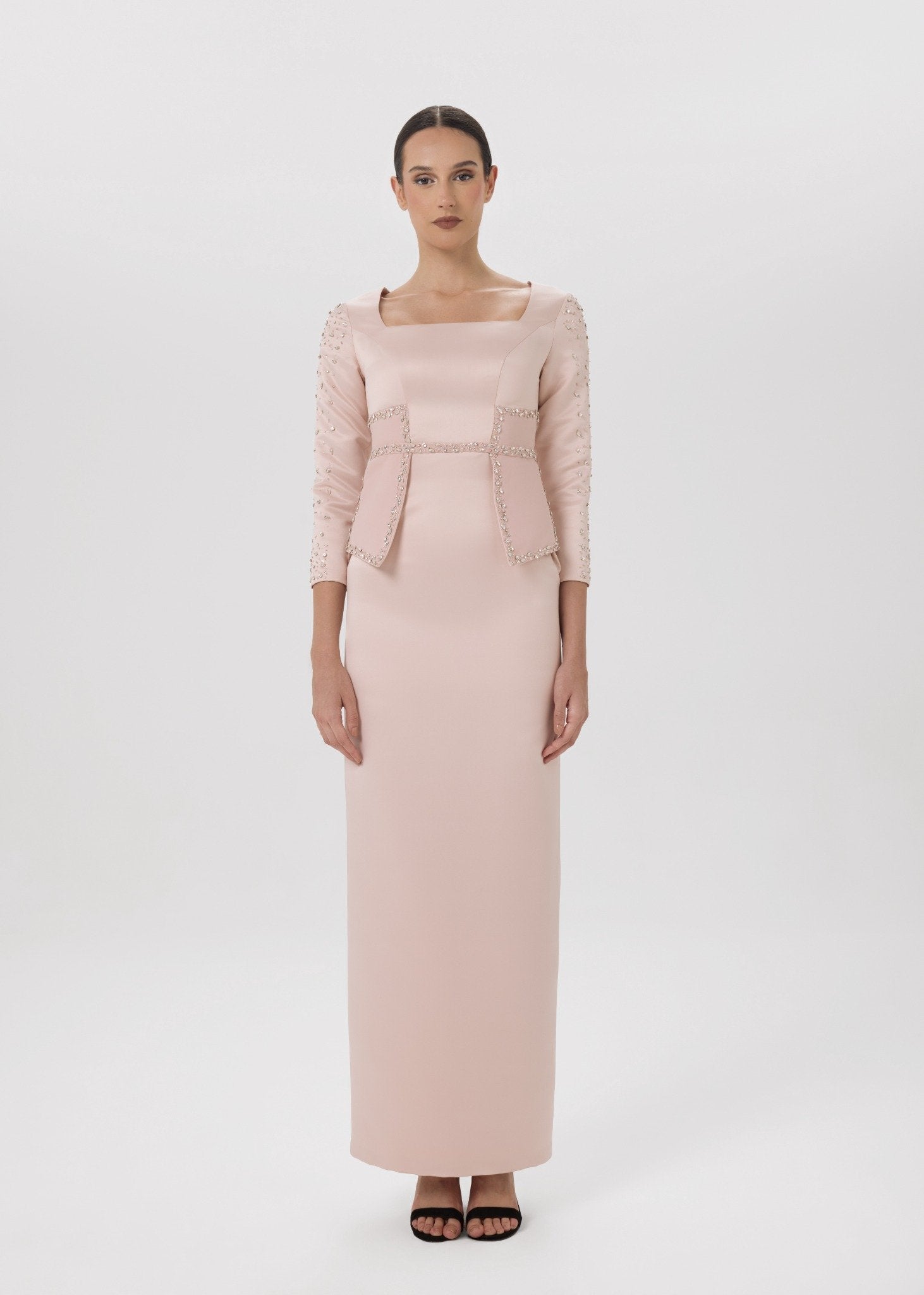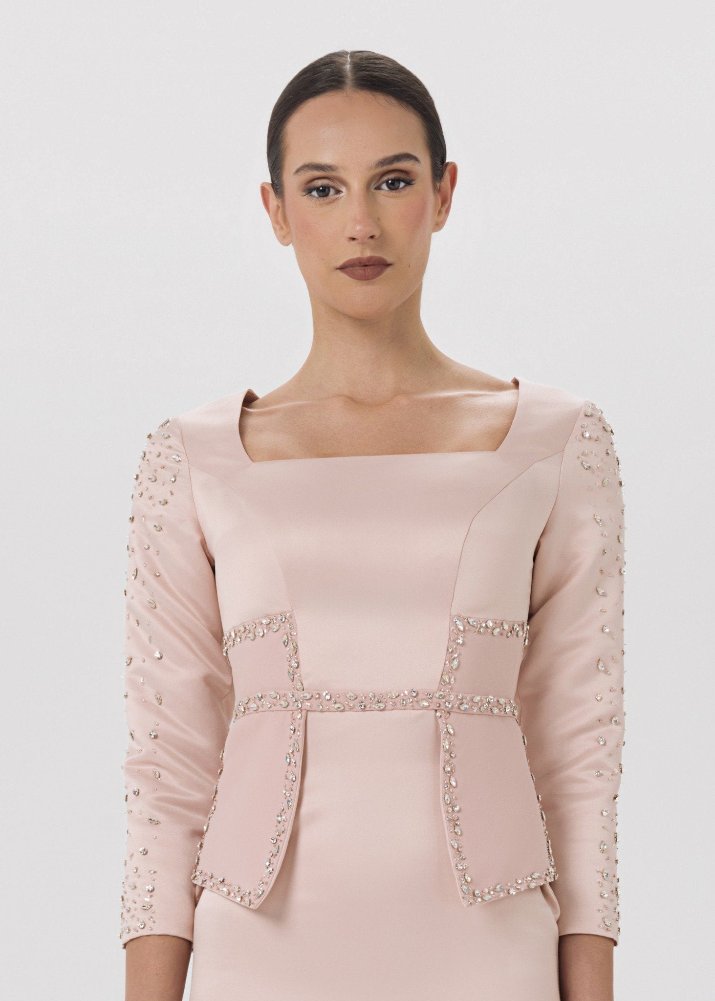 A sculpted blush-toned gown designed with a structured square neckline, long embellished sleeves, and a crystal-detailed peplum waist. The sleek column silhouette highlights the figure while maintaining timeless elegance. Perfect for formal evenings, receptions, and luxury occasions.