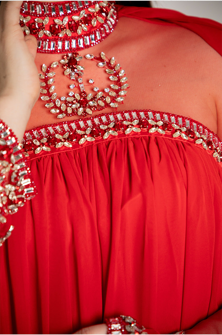 Hand-embroidered red chiffon dress with elegant layered flow.