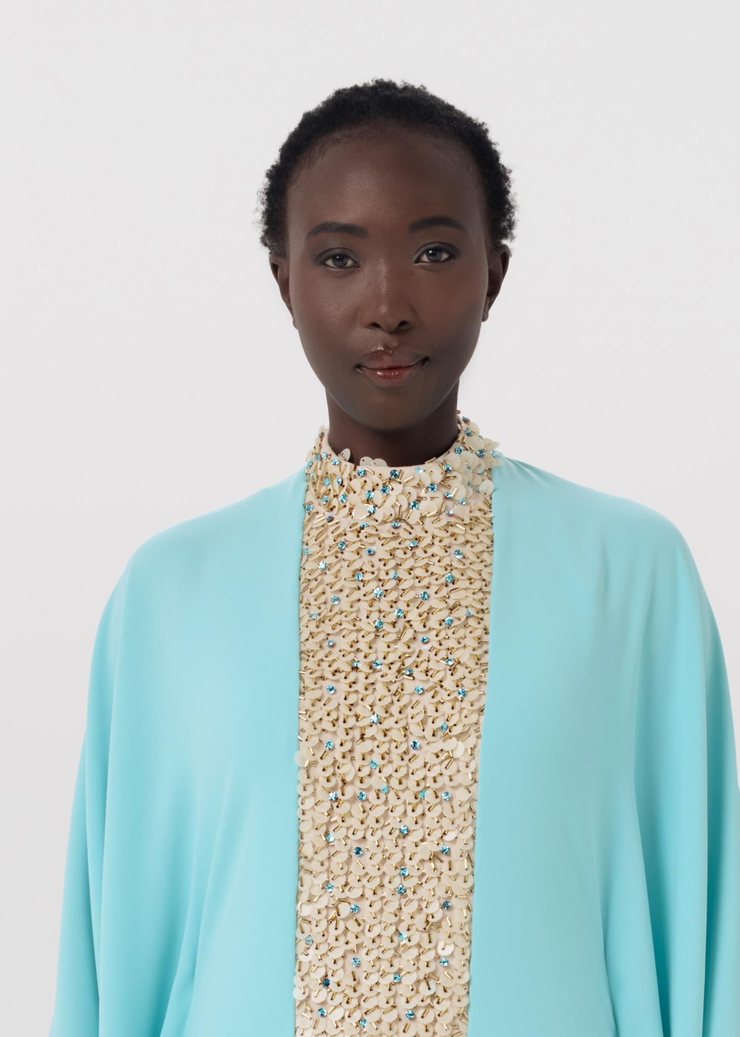 A flowing aqua-toned gown designed with a dramatic cape silhouette and a striking crystal-embellished front panel. Crafted to move beautifully with every step, this piece blends modern elegance with timeless glamour, making it ideal for evening occasions, formal events, and luxury celebrations.