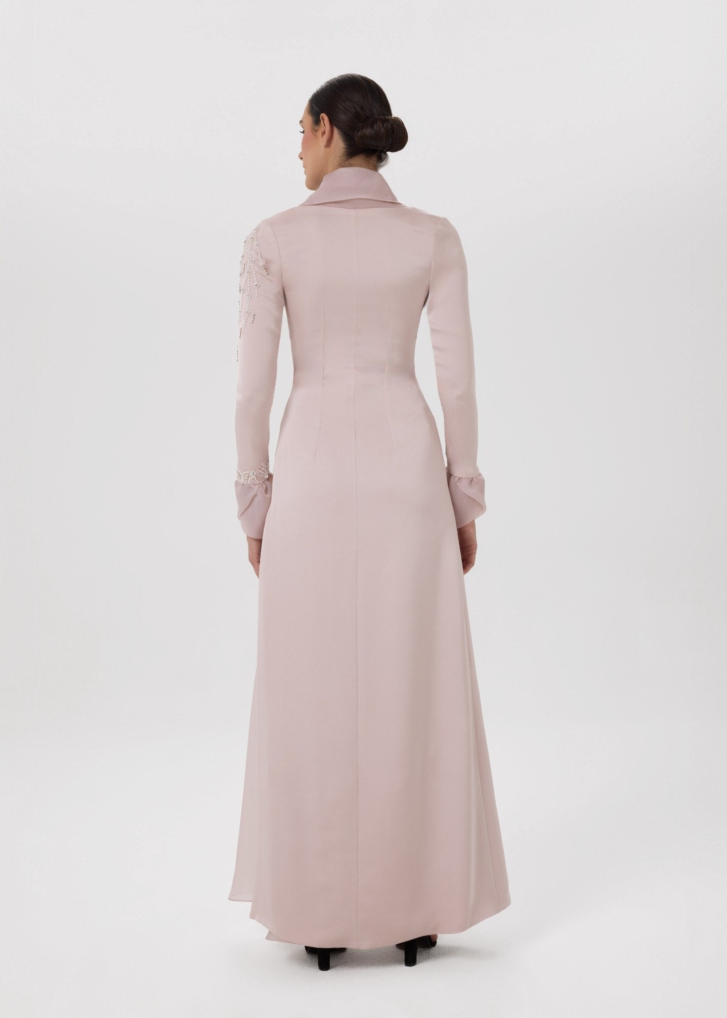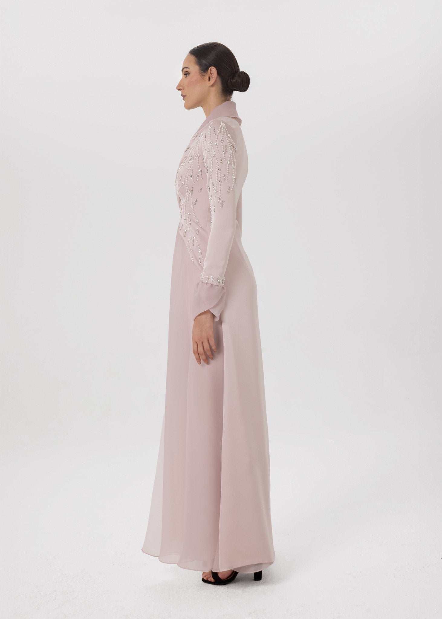 A refined blush-toned two-piece gown featuring a sculpted wrap-style bodice with an elegant shawl collar. Delicate hand-embellished detailing adorns the shoulder and sleeve, adding subtle artisanal charm. Paired with a soft, flowing skirt, this ensemble offers timeless sophistication for formal evenings and special occasions.